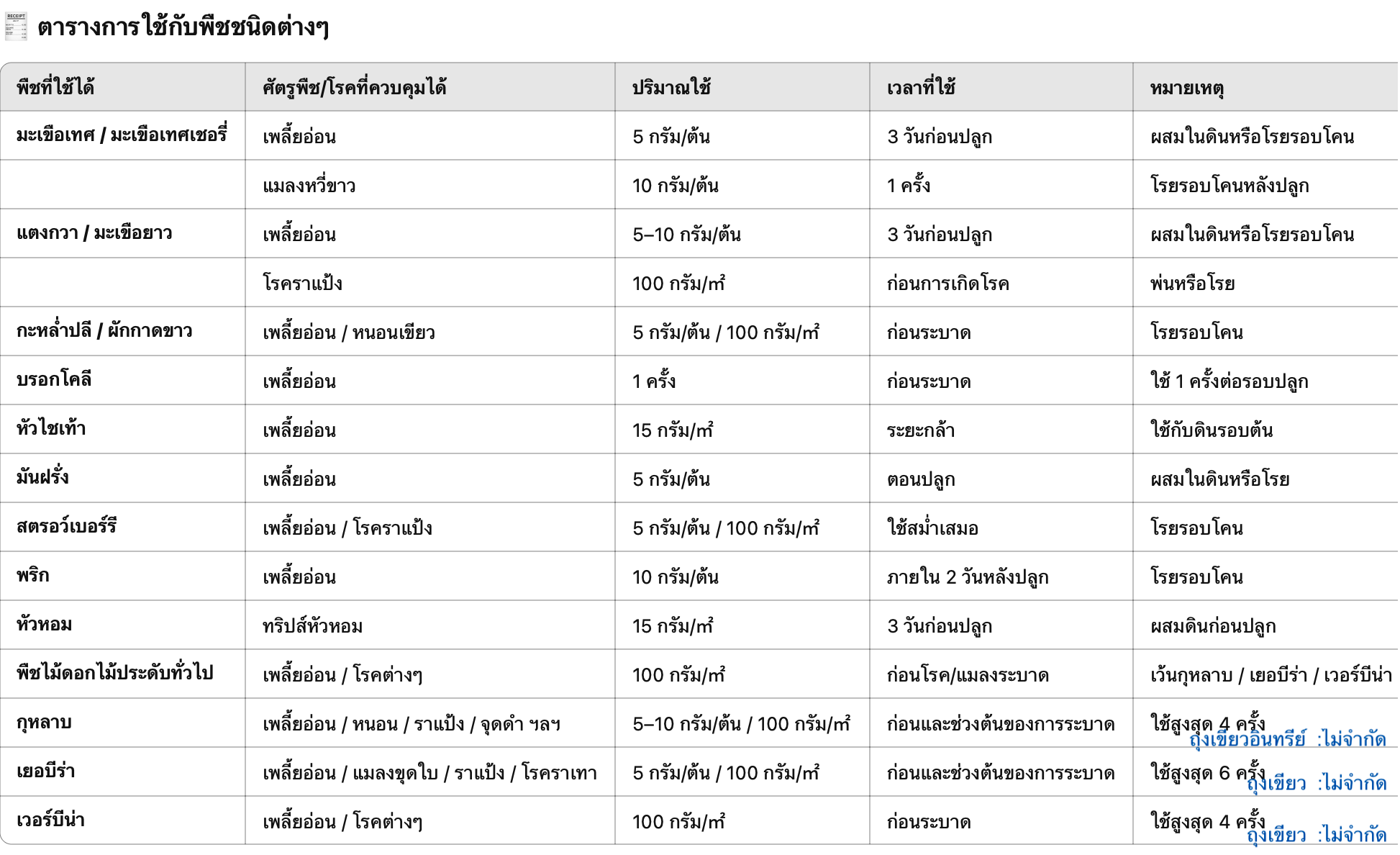 ใช้ได้กับไม้ดอก ไม้ประดับ ส่วนพืชผักต้องศึกษาระยะหยุดใช้ยาก่อนเก็บเกี่ยว